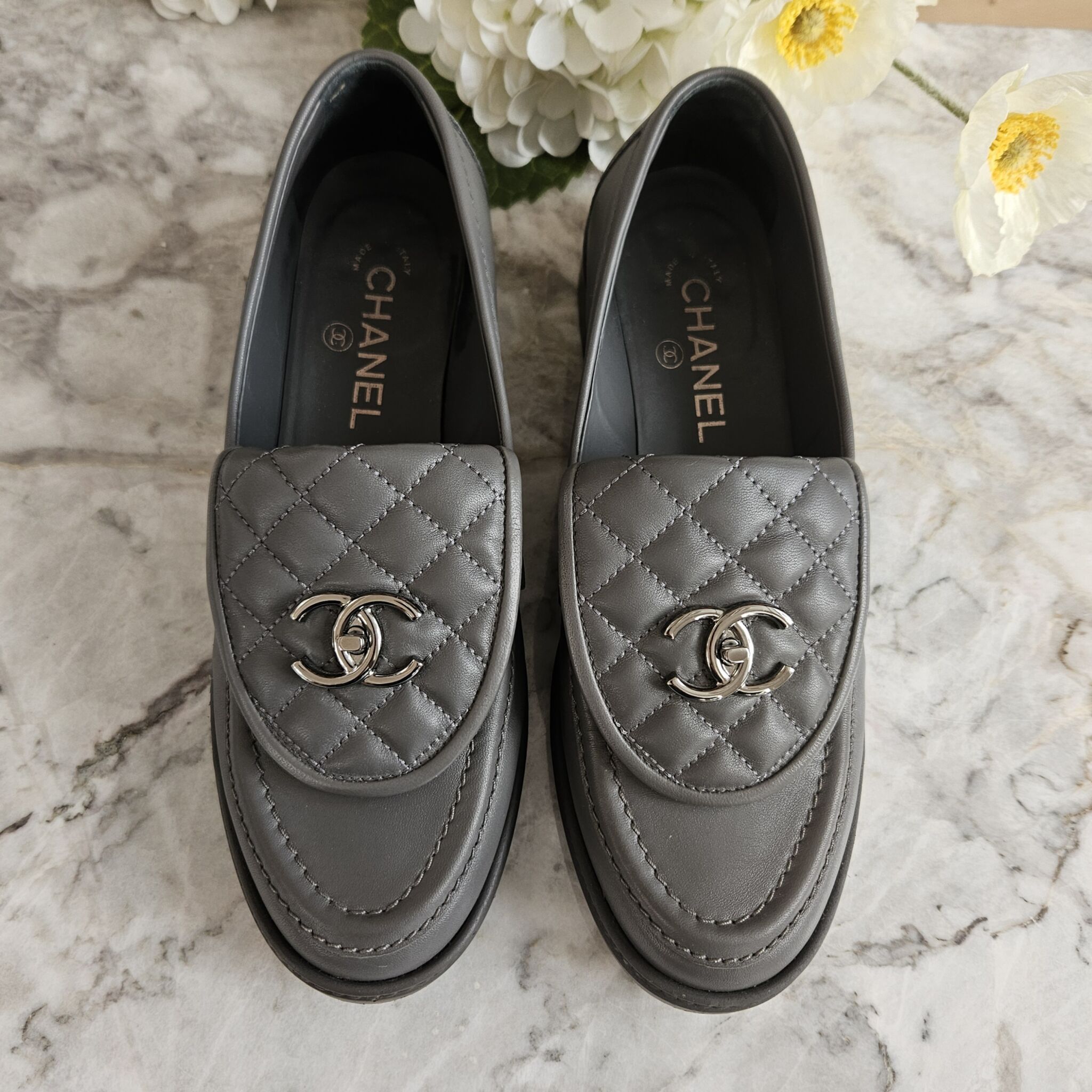 De klassiske og utrolig populære Chanel Classic Quilted loafers lavet i den flotteste mørke grå farve med sølv CC logo størrelse 39.5. Kan nemt bruges til kjoler, jeans og shorts.