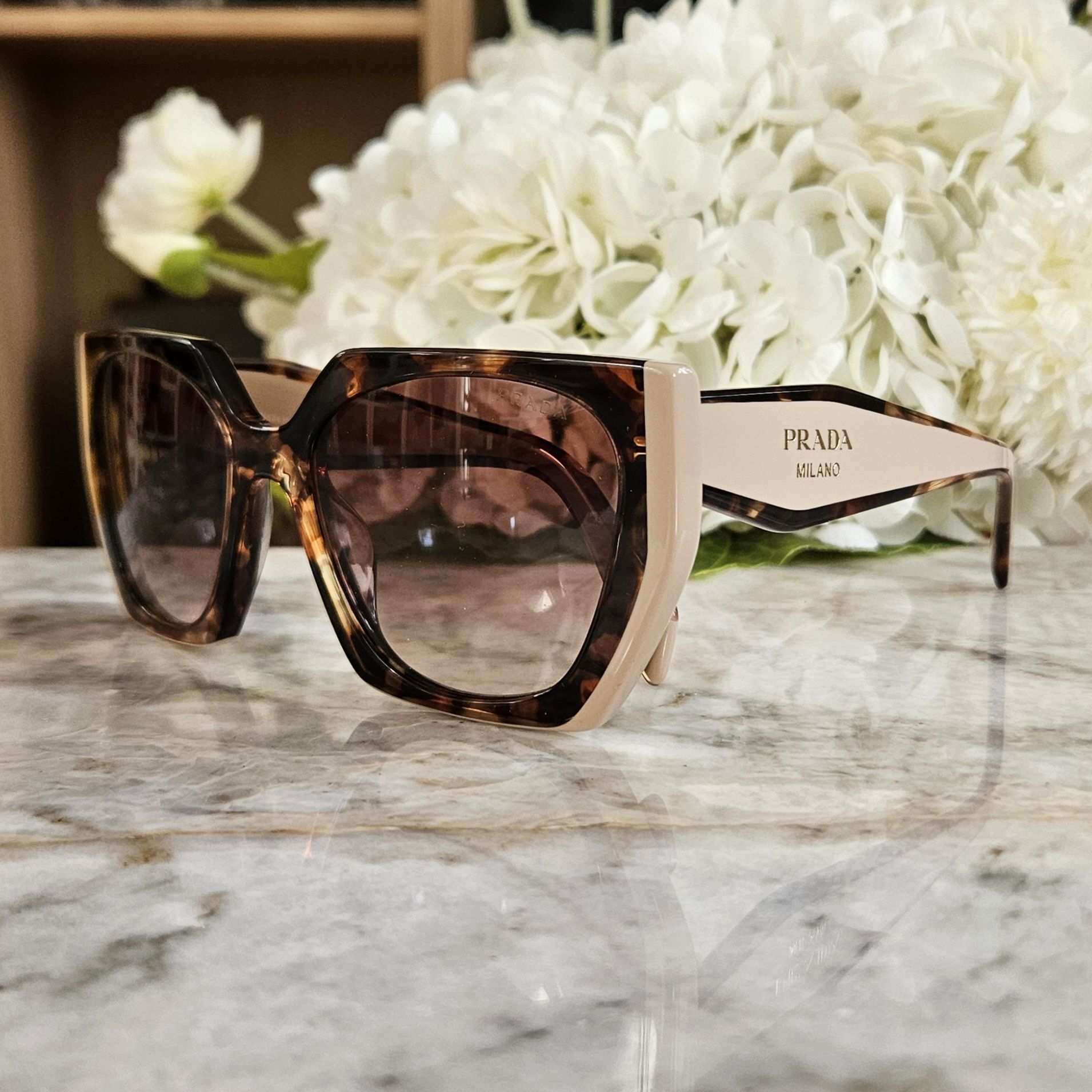 Super fede Prada solbriller lavet i beige og tortoise med brune glas og Prada logo på siderne. Nypris: DKK 3050 / 420 €